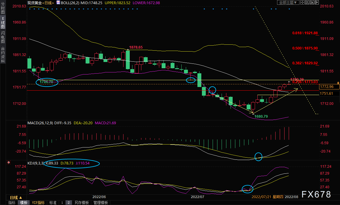 4小时级别:单边上涨;但MACD两次顶背离后有死叉趋势,KDJ初步死叉运行,金价自1680关口一度累计上涨了100美元,短线金价面临一定的回调风险,留意布林线中轨1753.16附近支撑,若回落至该位置下方,则增加短线看空信号;若能坚守该支撑,则金价仍有机会重拾涨势并继续冲高。